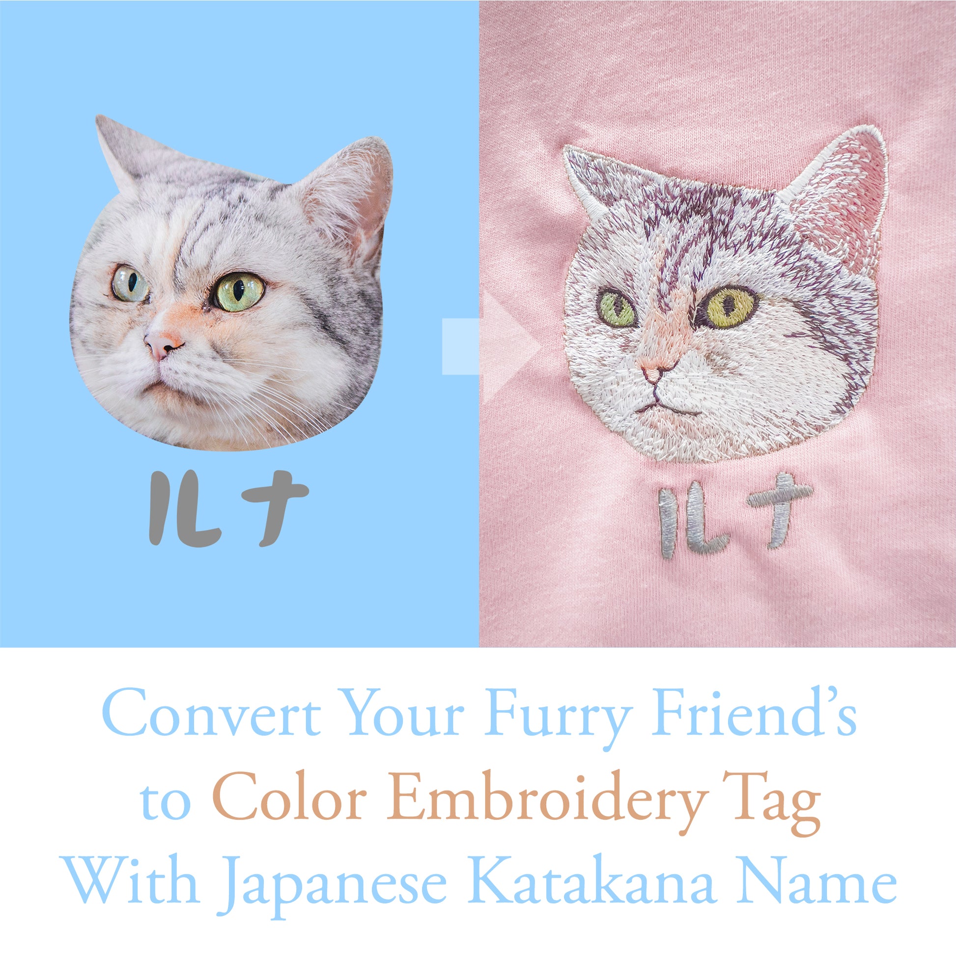 Customized Embroidery with your cat's face and name that honors their memory, and keep close to your heart.